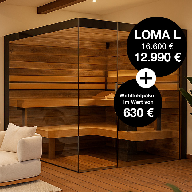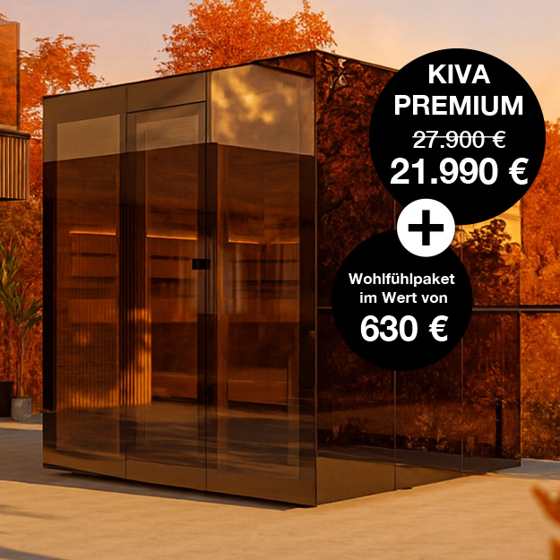 Nur während unserer Sauna-Wochen gibt es für Sie ein hochwertiges Sauna-Paket gratis zu unserer Gartensauna KIVA PREMIUM und unserer Innensauna LOMA L
